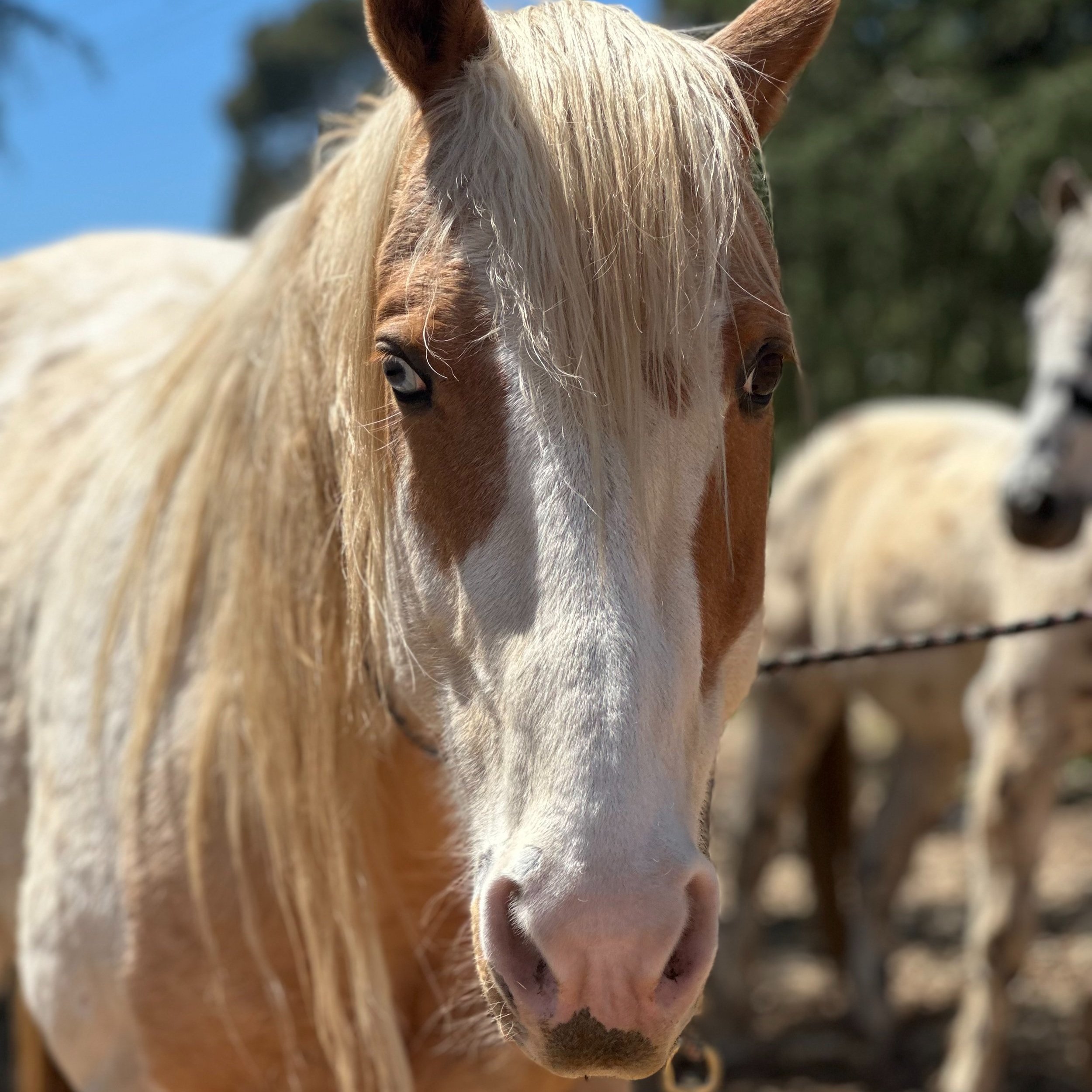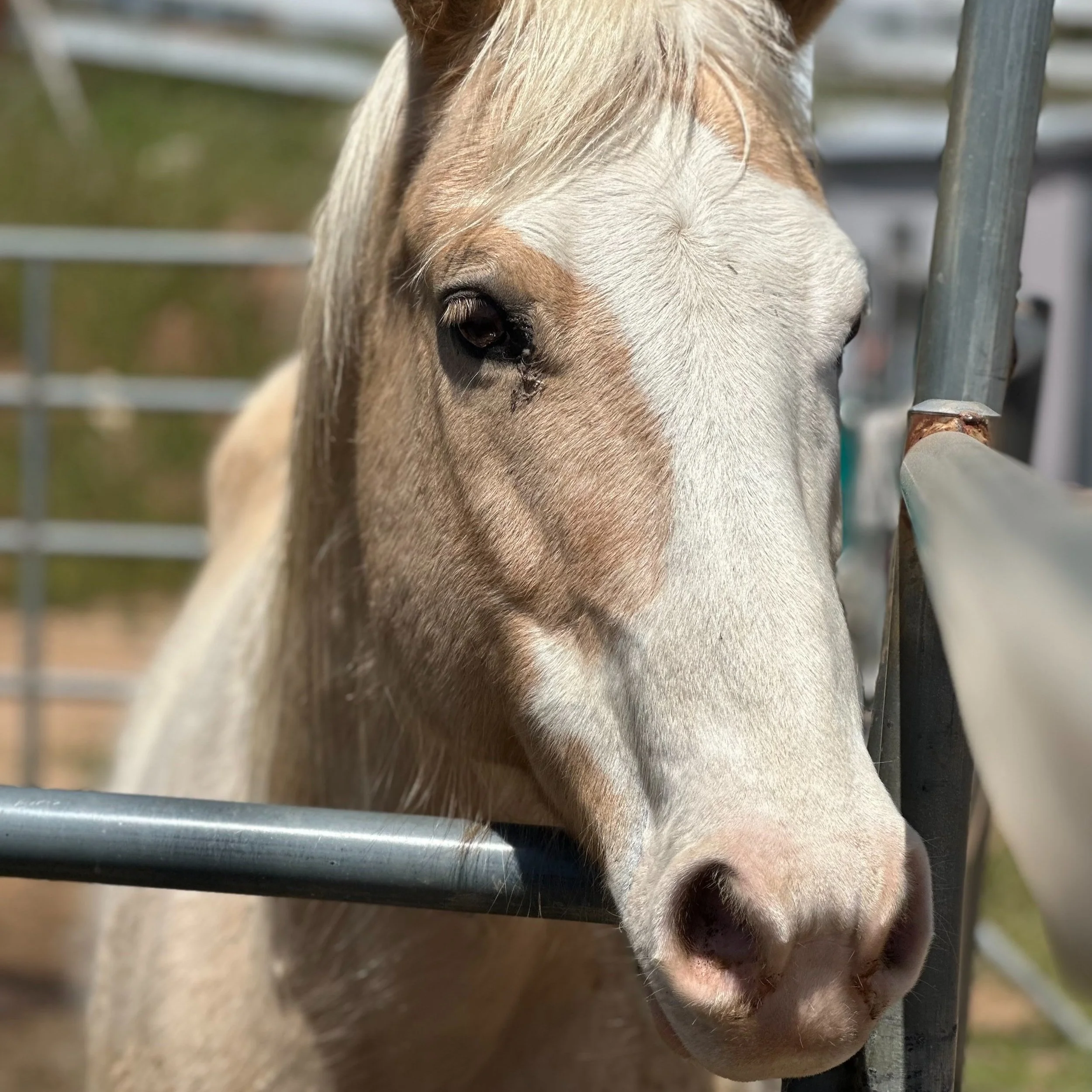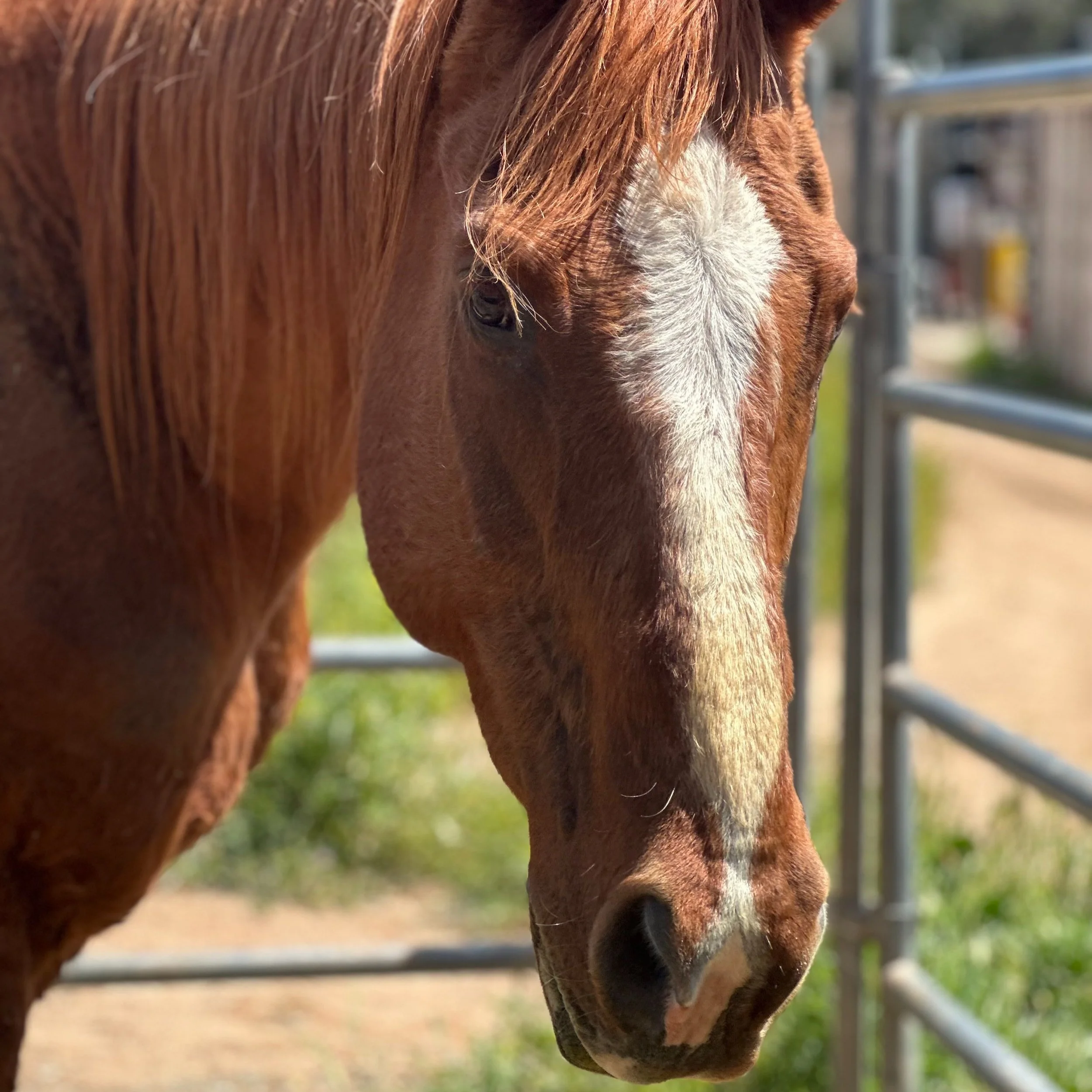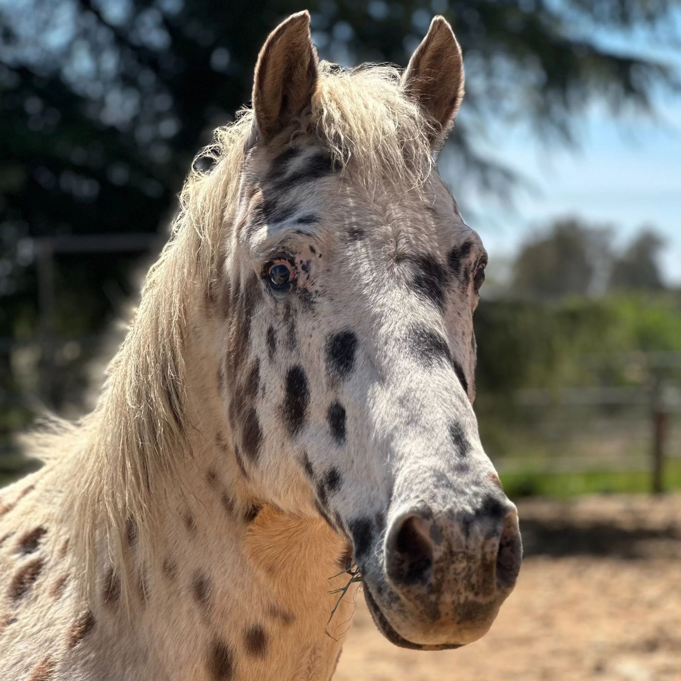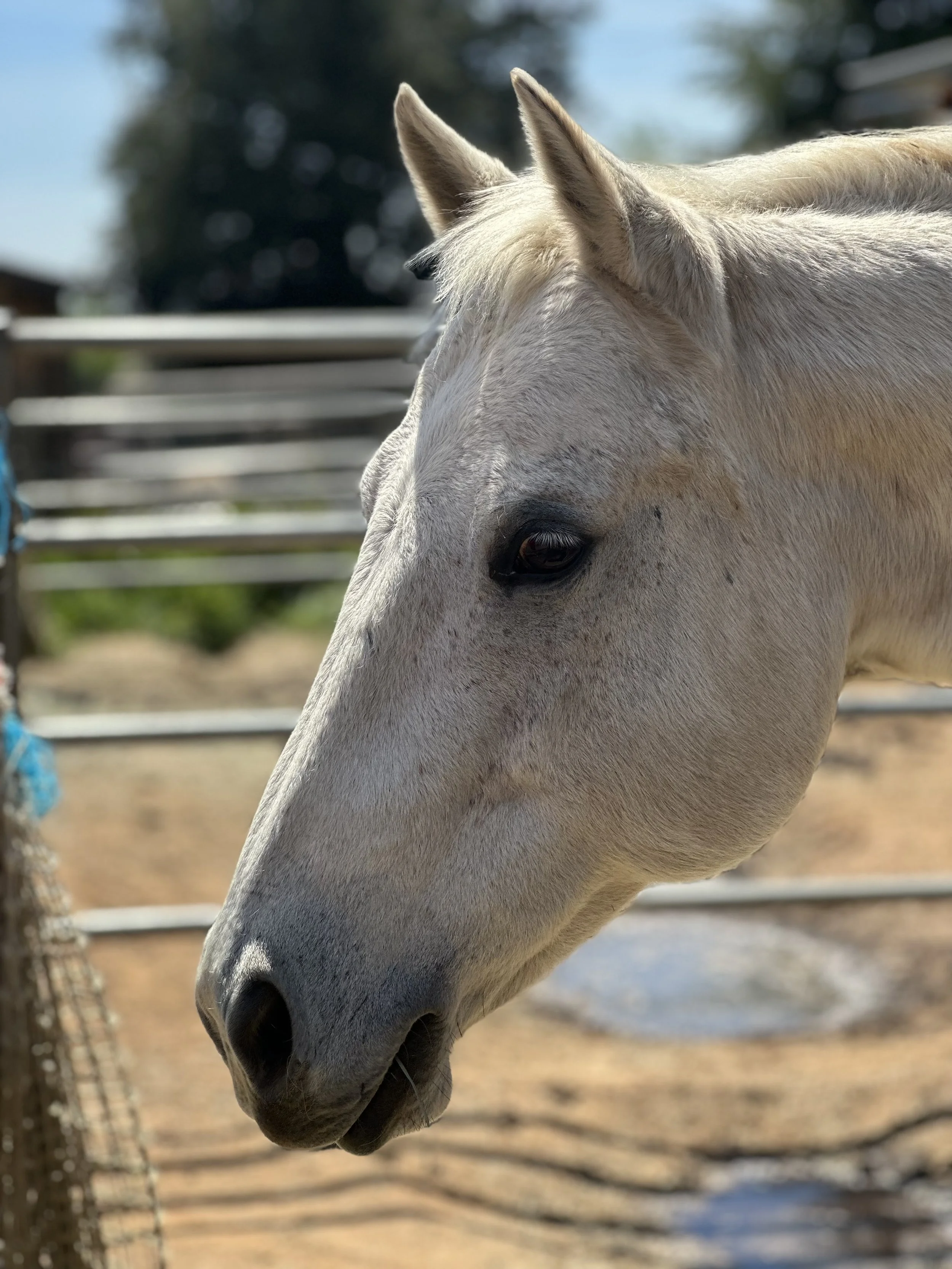 Spot the Wonder Horse came to live with us after his owners were moving out of state and could no longer care for him. He had been placed on a pasture for the past couple years and when we arrived to bring him to The Ranch, we discover he was almost completely blind. If you look closely in his eyes you will see his cataracts or what we like to call the stars in his eyes.
