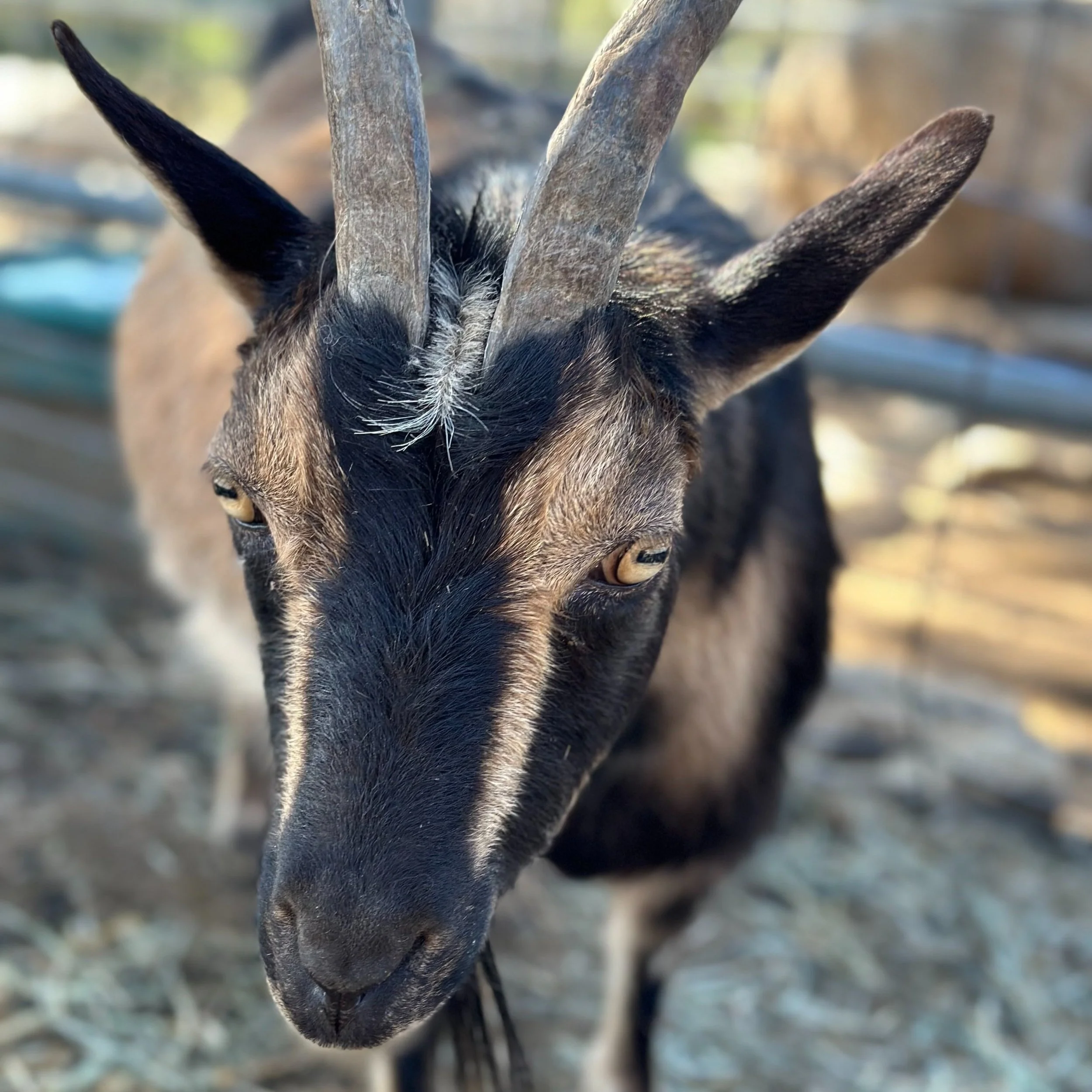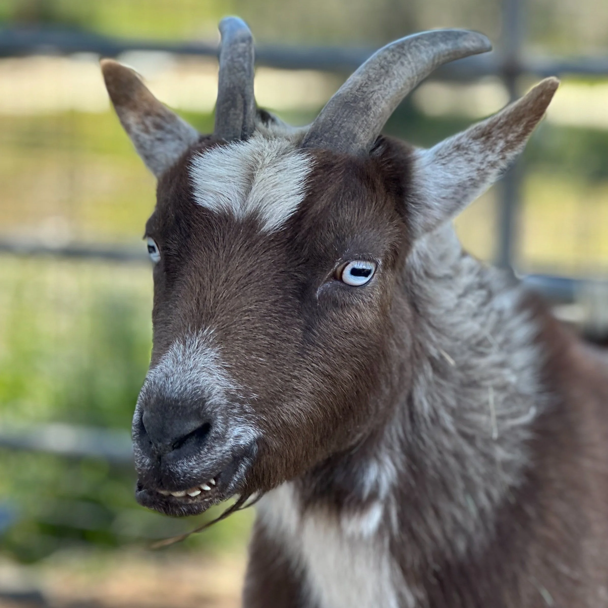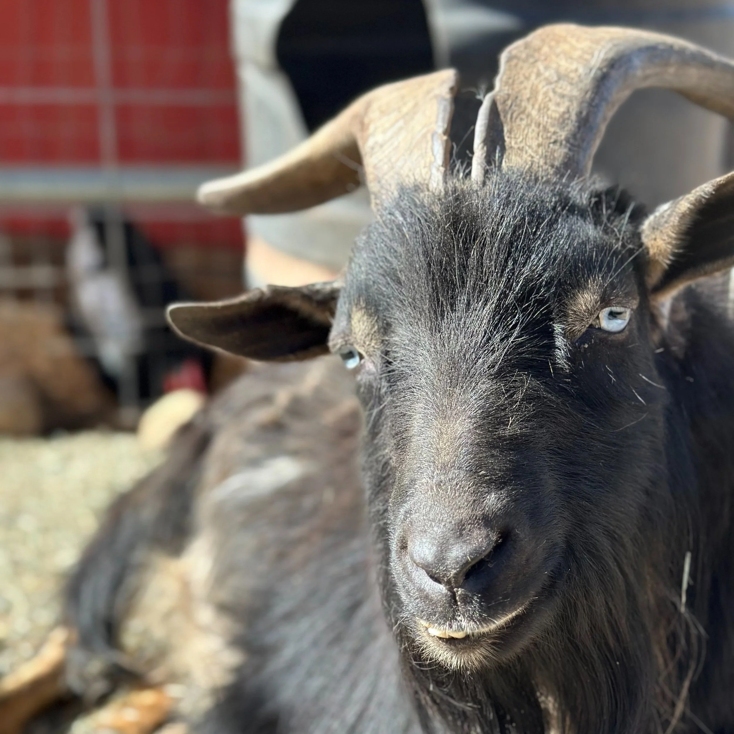 Tom Dooley was named after the folk song Tom Dooley by Leslie’s mom. He is never called Tom, only Tom Dooley. He spends his days doing what boy goats do, peeing on himself to make himself more attractive to the girl goats. We don’t know why boy goats think girl goats find this alluring, but it is the way of the goat world. We think Tom Dooley’s pretty blue eyes should make the girls like him!