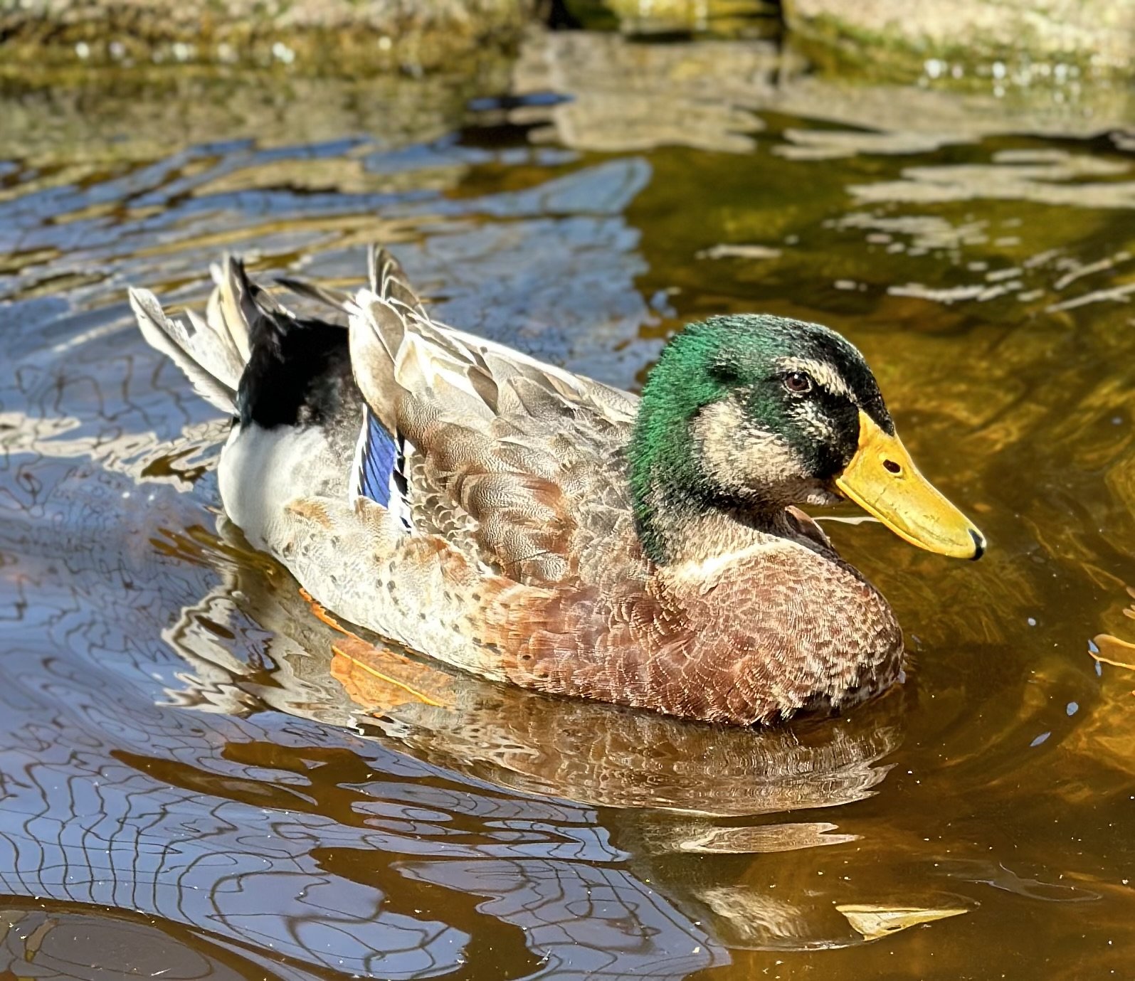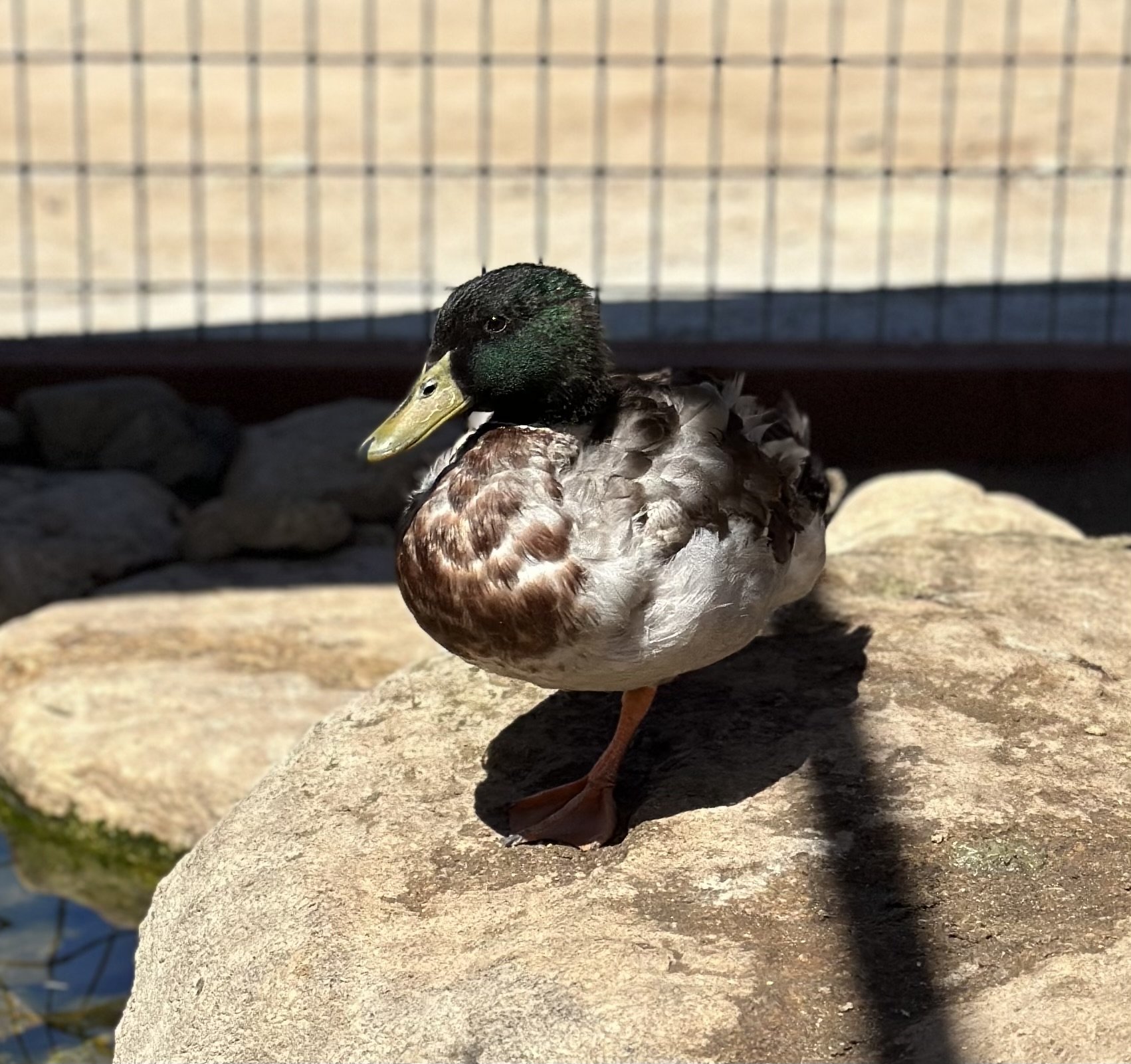 Pebbles is our resident mallard. The most easily recognized duck, mallards are sexually dimorphic, meaning you can look at them, and tell if they are male or female. Males have a glossy green head, that the females do not.