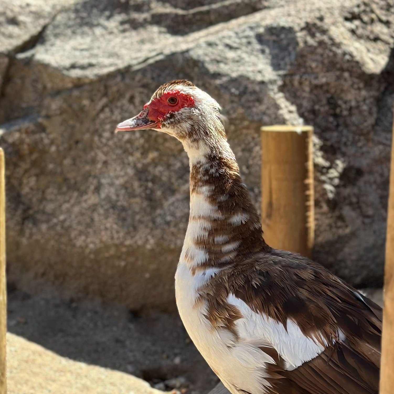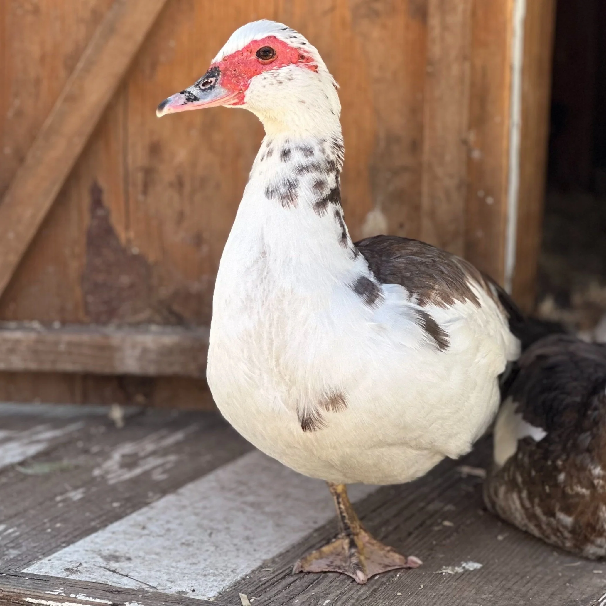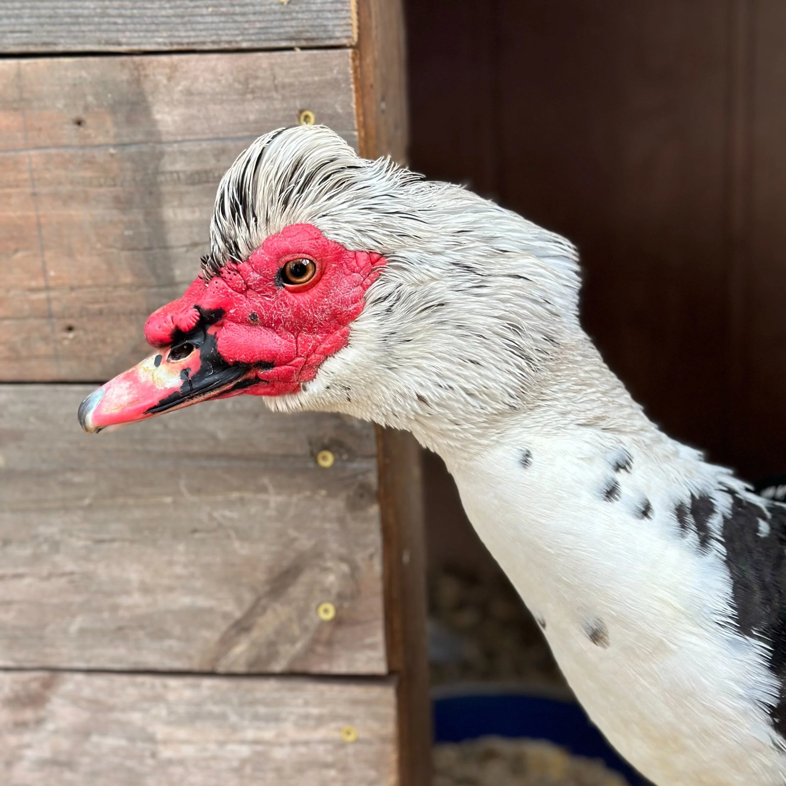 Muscovy are one of the few breeds of ducks that don’t “quack” like a duck. The unique red skin around their eyes is called a wattle. Ducks can not sweat, so the wattle helps release excess heat during warm days.