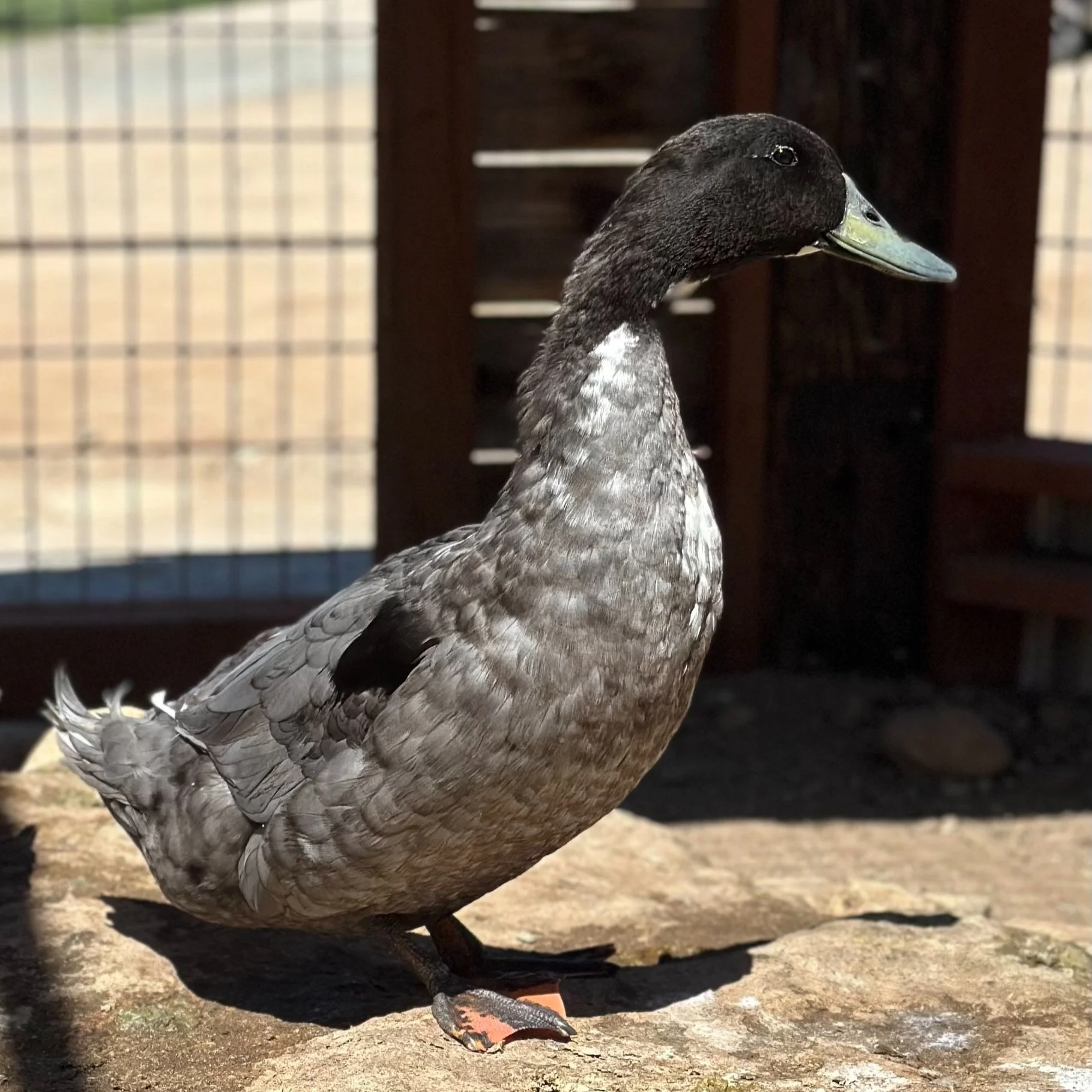 Sammy flew into a friend’s yard one day. Where she came from is anyone’s guess, but the house she landed at was certainly not equipped to have a duck, so she came to Pond Digger Ranch. Adopted into the Muscovy clan, she is happy as a clam to be in the duck pond at Pond Digger Ranch.